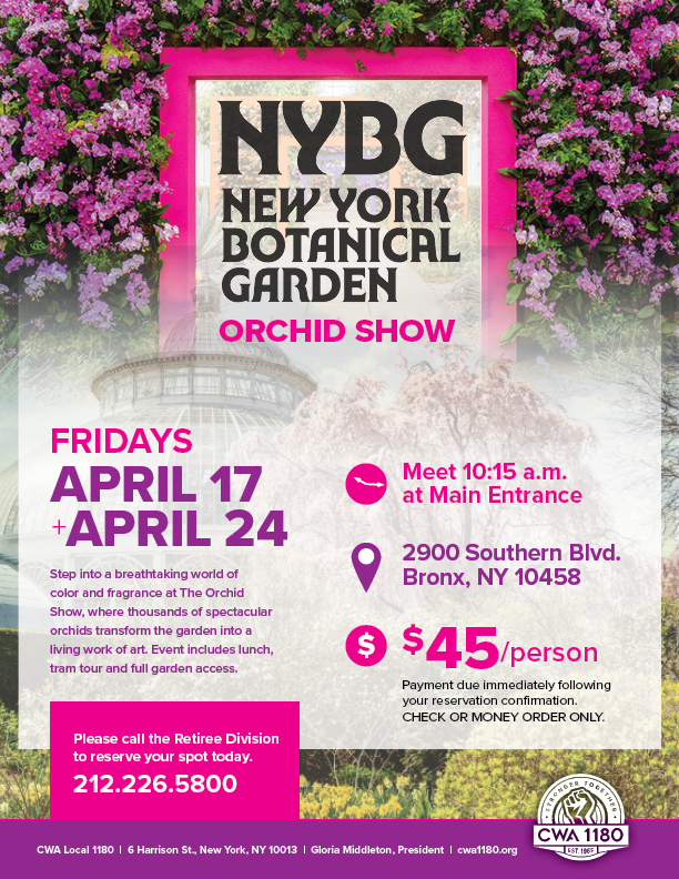 Fri. 4/17 | NY Botanical Gardens Orchid Show $45/person | 2900 Southern Blvd. Call the Retiree Division to reserve your spot today: 212.226.5800 |