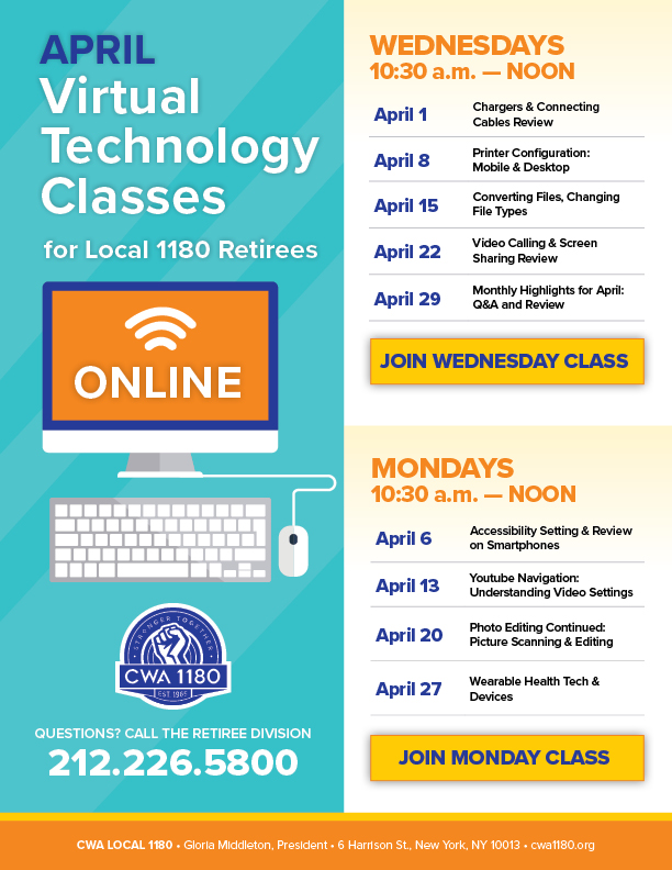 | Mon. 4/20 | Online Computer & Tech Class Photo Editing Continued: Picture Scanning & Editing | Join from PC, Mac, iOS or Android: |